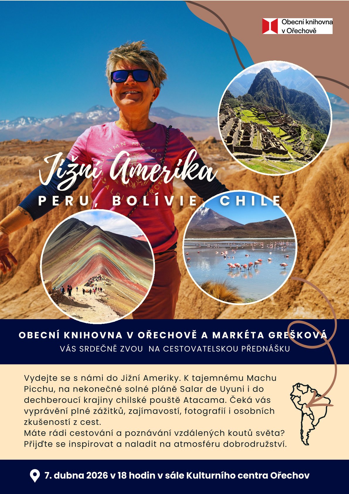 Vydejte se na nezapomenutelnou cestu do Jižní Ameriky! Společně s cestovatelkou Markétou Greškovou navštívíme tajemné Machu Picchu, projdeme se po nekonečných solných pláních Salar de Uyuni a objevíme dechberoucí krajinu chilské pouště Atacama. Čeká vás poutavé vyprávění plné zážitků, zajímavostí, krásných fotografií i osobních zkušeností z cest.